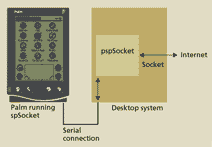 The architecture of my Serial Port Socket system uses what amounts to a client/server structure (see Figure 1). The client side depends on a class called spSocket (serial port Socket), which mimics the behavior of a Socket object to the application. The spSocket object talks through the serial port to an application running on the desktop that implements the pspSocket (proxy for serial port Socket) class. This target application is also written using the Waba classes. (The pspSocket class is accompanied by another class that, as you'll see, forms the outer loop for handling incoming requests. But because most of the work is done by pspSocket, I'll say that the desktop proxy implements that class.)