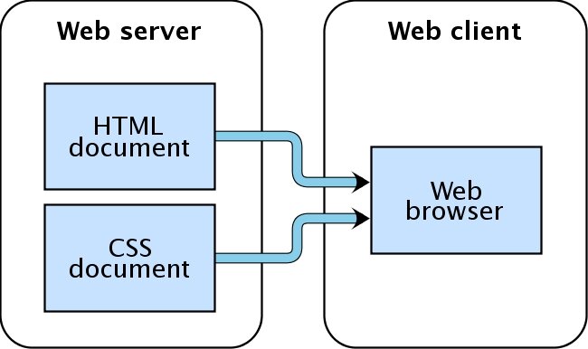 The HTML and CSS are located on a Web server, which transit through the network to the client browser that displays the page. The CSS customizes the look of the pages according to the HTML content and the rules defined in the CSS file. |