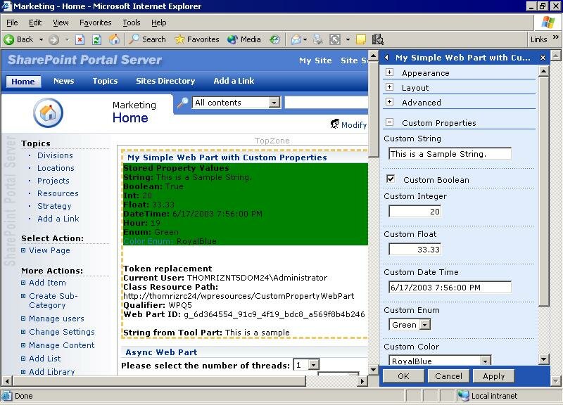 Figure 1. Editing Custom Properties in Windows SharePoint Services Web Part Pages Web Part Pages in SharePoint sites have built-in support for editing your custom properties either in the default ToolPart or in a custom ToolPart that you build. This shows editing the custom properties in the sample application using the standard SharePoint ToolPart. |