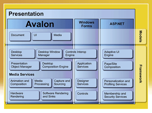 | Desktop Window Manager: Handles most of the traditional hard work of window management, such as minimizing, maximizing, and displaying dialog boxes. New features include page-based navigation and support for Extensible Application Markup Language (XAML). |