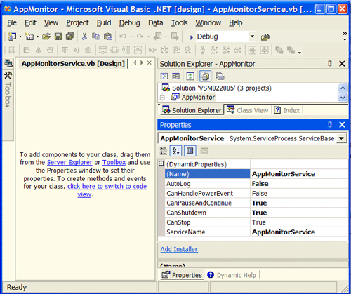 Set the properties that define what events your service will respond to. You can also tell Windows to log all service events in the Windows Event Log by enabling the AutoLog property.