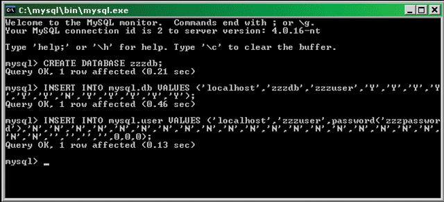 Type these commands to create a MySQL database and the root user and its credentials.