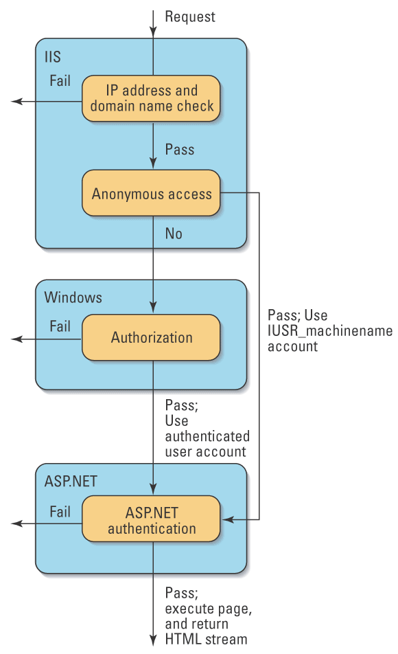 IIS performs authentication, passes to Windows for authorization if necessary, and then passes to ASP.NET for final authentication.