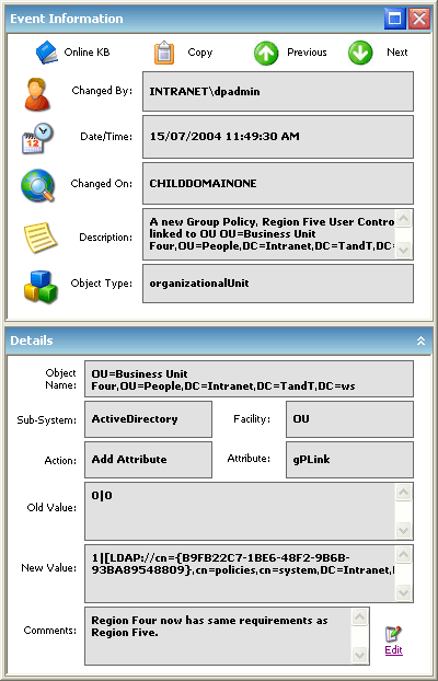 Figure 1. A Change Event in Change Auditor. Change Auditor records all change events in the directory. The CAAD interface even supports the addition of comments to each event to help you remember why the change was made when you view it again down the road. |