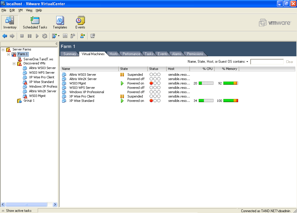 Figure 1. Managing the Farm. VMware VirtualCenter lets you manage an entire farm of virtual machines running on physical host machines. First, it gives you a global view of active and inactive resources, and second, it lets you provision and move machines around the physical hosts. |
