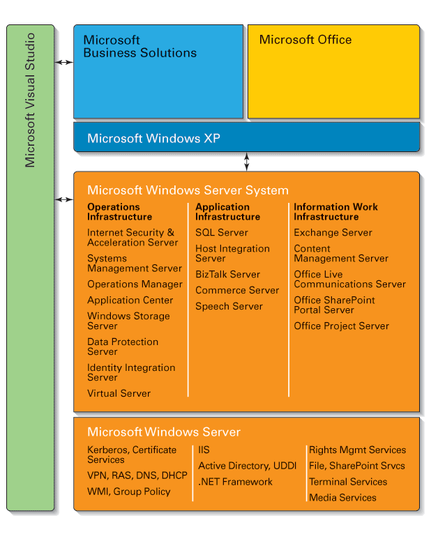 Figure 4. The Windows Server System. The Windows Server System stack is designed to provide integrated functionality at all levels of enterprise IT needs. It provides either individual functionality or integrated solutions and vastly simplifies management through an integrated look and feel. |