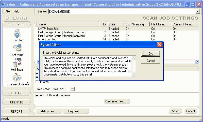 Figure 3. Entering Disclaimers. Outgoing mail can include disclaimers such as the one displayed here automatically. You can even configure different disclaimers for different destinations, giving you a simple and effective means of protection on your intellectual property. |